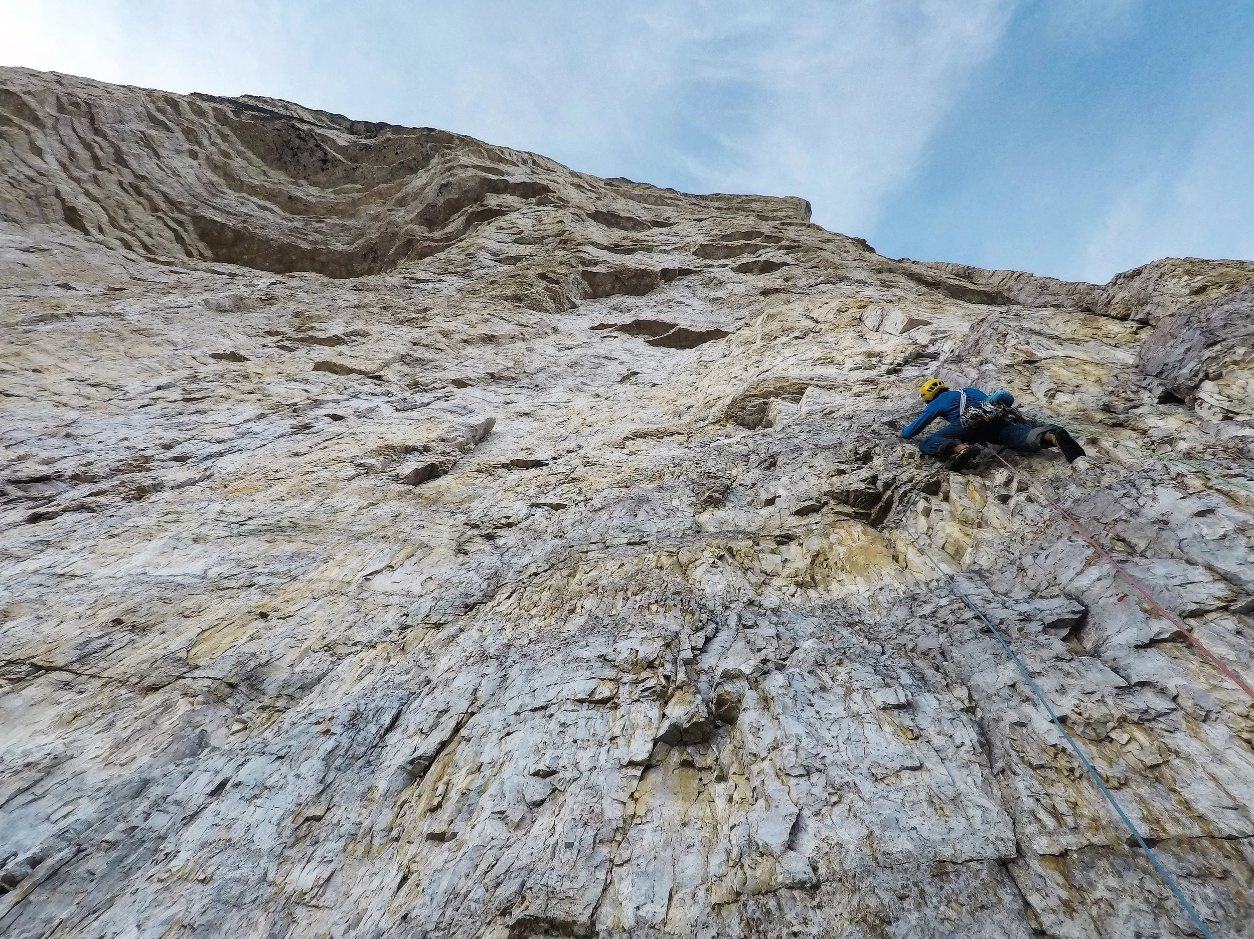 free ascent of Pressknodel 7c, cima ovest, north face.