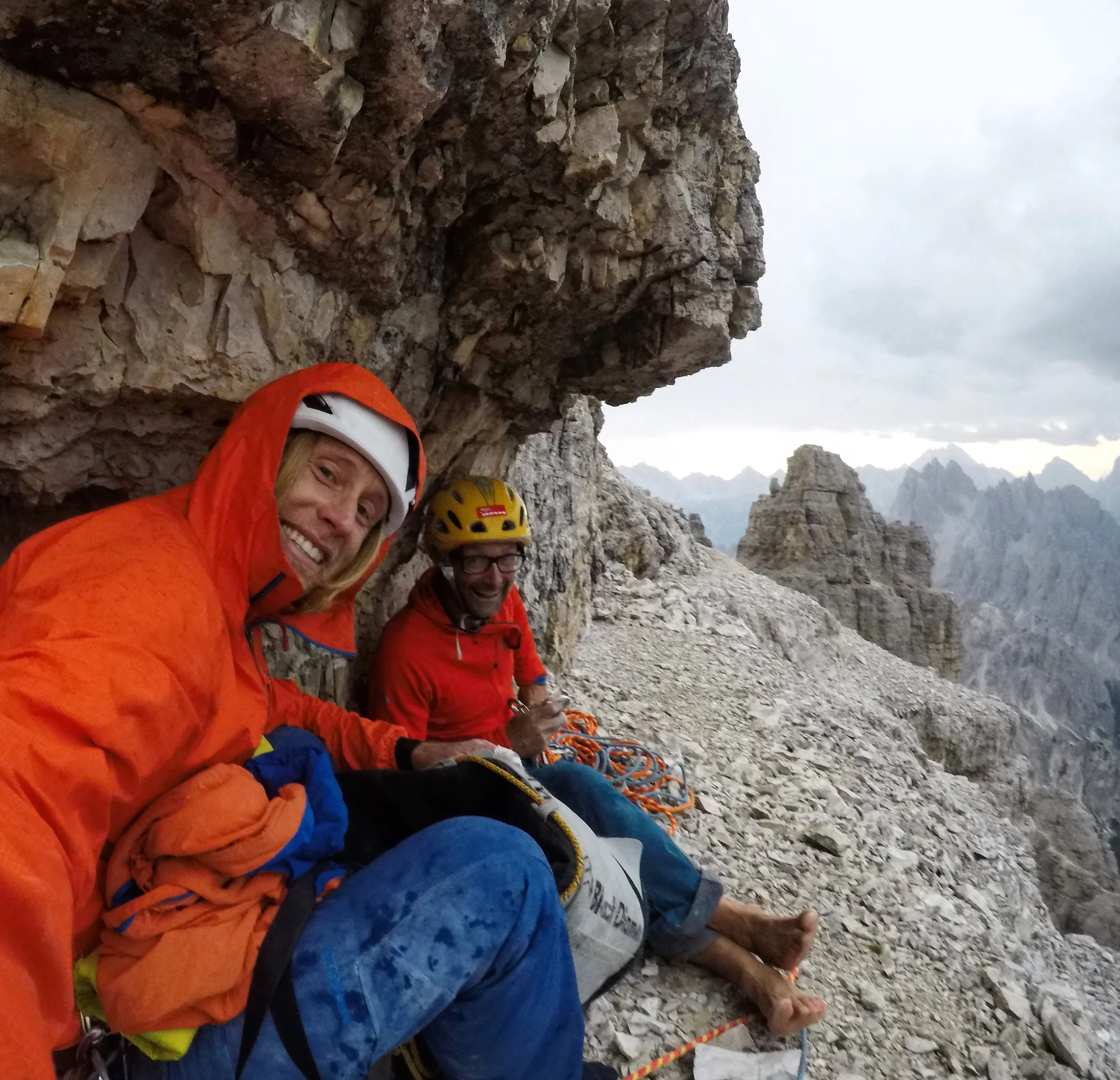 Any doubts about conditions were soon silenced as their ice axes bit into the pristine neve runnels, which led up the fault line above. More steepness on perfect granite provided top notch mixed climbing on thin hooks. However, at midday the team had worryingly only got to about a third height on the face. A gambling man would surely have placed a large bet on them shivering away a cold night without bivi kit at this point.